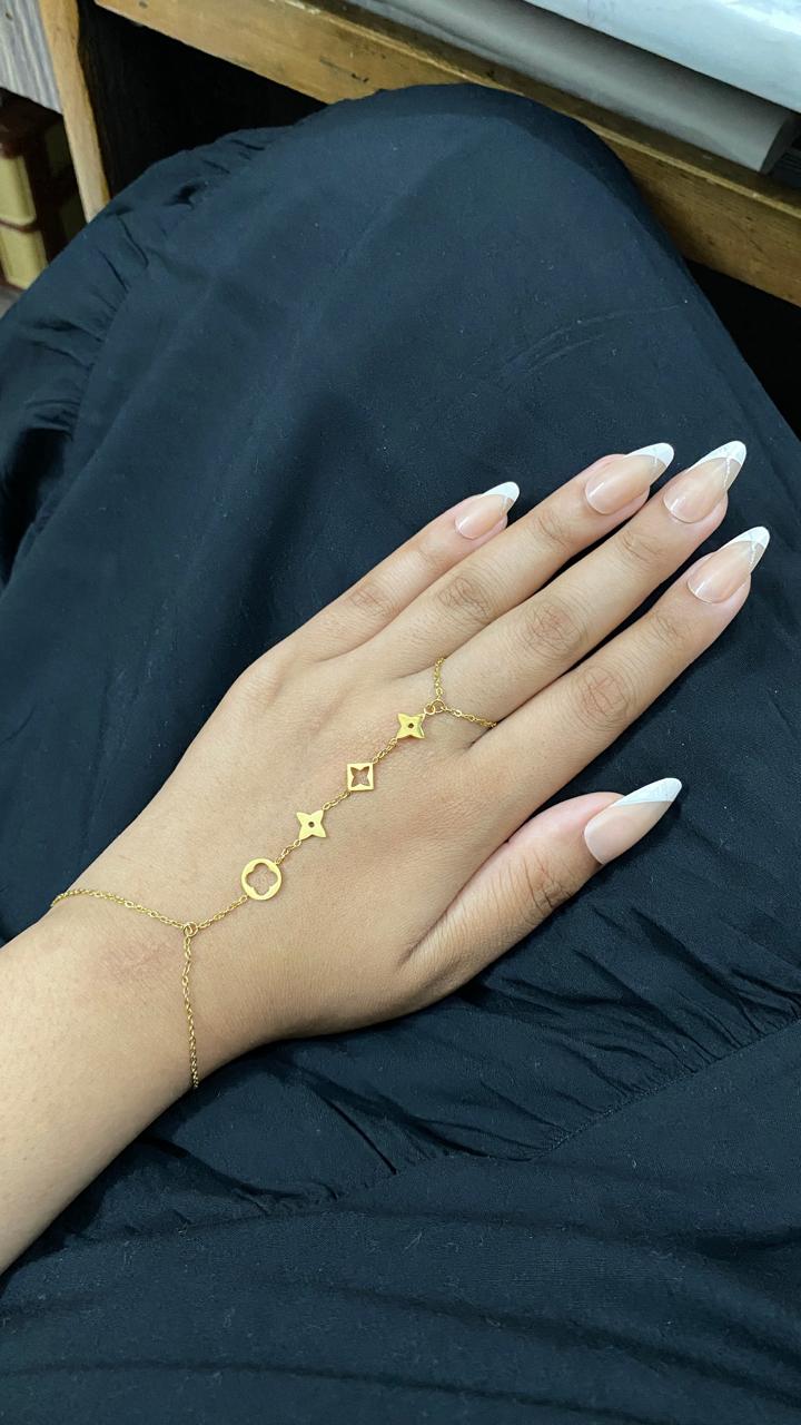 The Amora Link Hand Chain is an elegant, gold-toned accessory that seamlessly blends the sophistication of luxury design with everyday practicality. Crafted from durable stainless steel, this stylish piece features a delicate chain connecting a ring to a wrist bracelet, adorned with iconic geometric and floral-inspired links. It is waterproof and hypoallergenic, offering a comfortable, all-day wear experience with a touch of timeless glamour.
