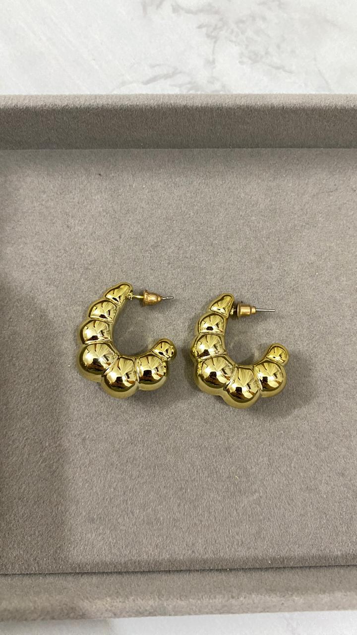 Design & Aesthetics: The continuous, clustered texture provides a playful yet sophisticated dimension, moving away from traditional smoothness. The high-gloss, gold-toned finish reflects light intensely, giving the effect of a radiant “beam” of light around the ear.