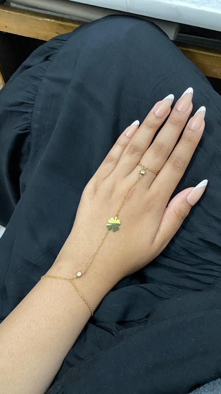 A delicate gold hand chain featuring a dainty four-leaf clover charm and subtle crystal accents perfect for daily elegance and a touch of luck wherever you go.