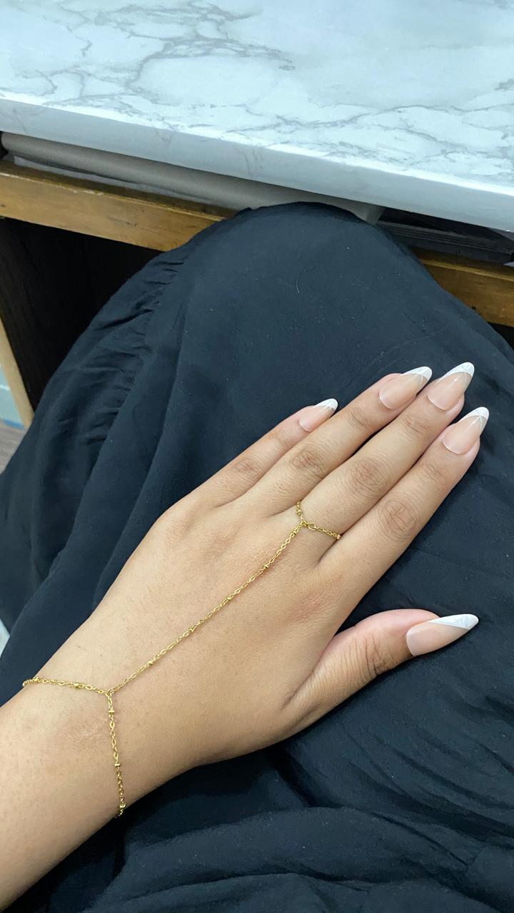 Meet the Elle Hand Chain, a dainty ring-connected wrist chain crafted for those who love understated elegance. Its fine gold-toned links wrap gracefully around the wrist and finger, creating a seamless, flowing silhouette that enhances the natural beauty of your hand.
