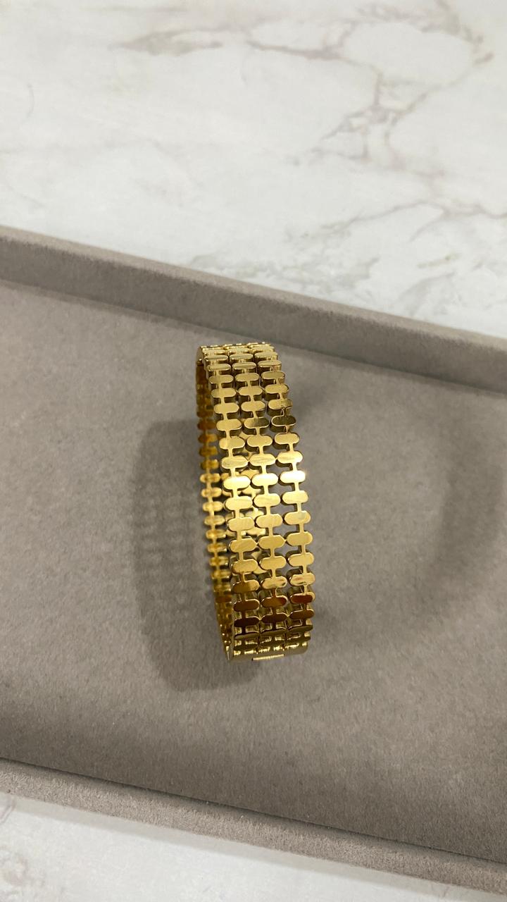 Flex Link Cuff  a modern, gold-toned statement cuff crafted from premium stainless steel. Its flexible linked design sits comfortably on the wrist while offering long-lasting shine and everyday durability. Water, sweat, and tarnish resistant made to stay beautiful, always.