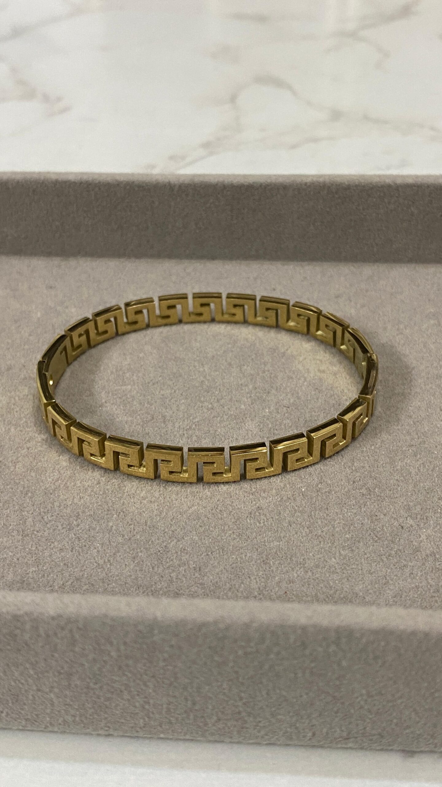 The bracelet features the classic Greek Key or Meander pattern, a design that symbolizes infinity and the eternal flow of life. The repeating geometric links form a bold, substantial band that offers an eye-catching and modern look. This specific style is often referred to as a “handcuff” or “cuff” bracelet in the market, though it functions as a standard hinged bangle with a secure clasp closure.