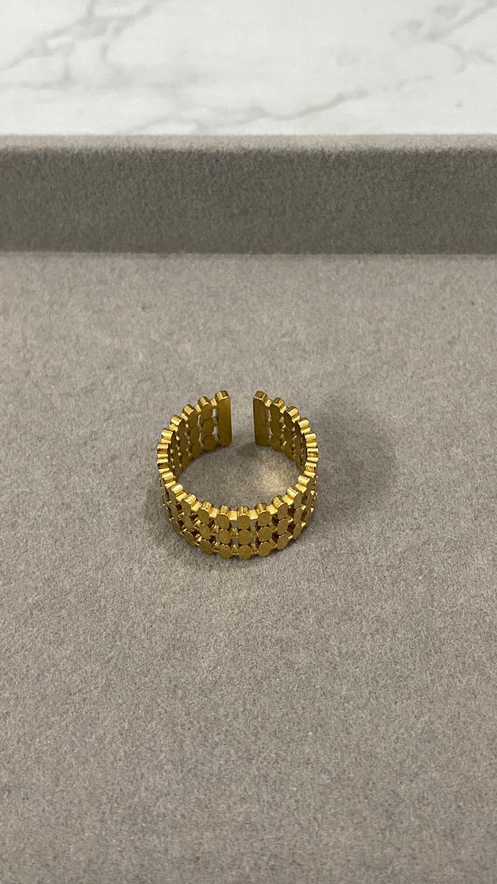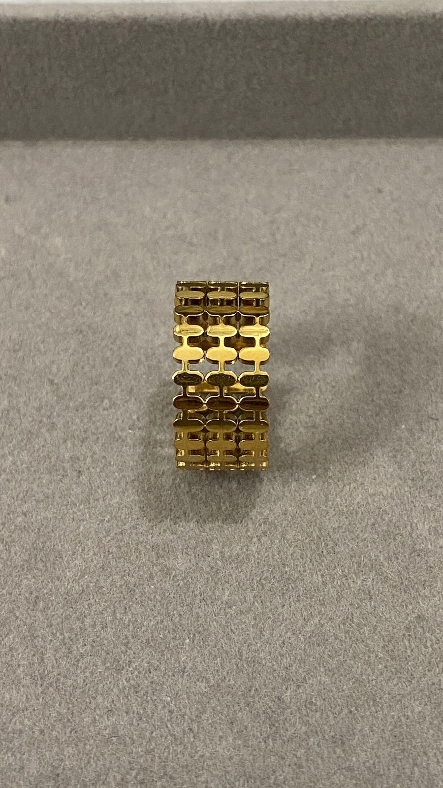 - Design Aesthetic: The ring features an intricate, open geometric pattern resembling a honeycomb or H-link design. This wide band offers a contemporary, eye-catching look that is both modern and substantial.