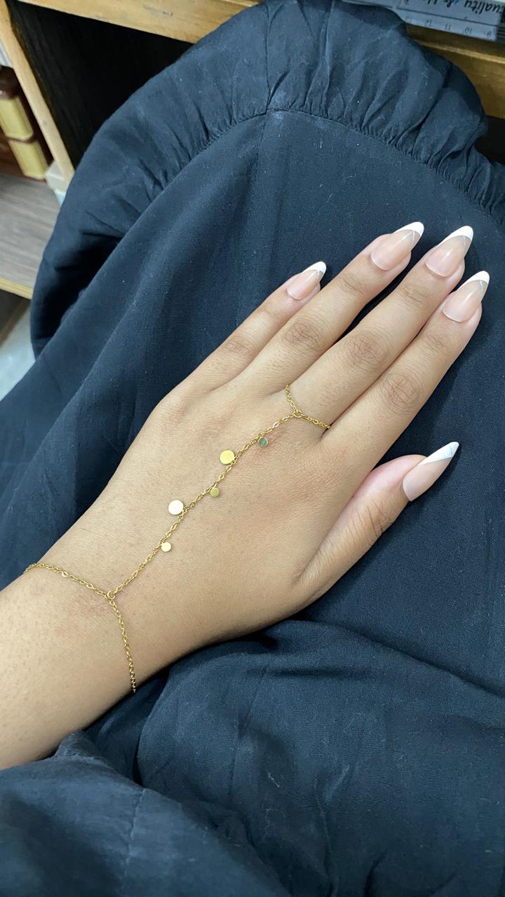 The Orbit Link Handchain is a refined expression of minimal elegance, designed with delicate circular links that flow seamlessly along a fine gold-tone chain. Inspired by the harmony and balance of orbital forms, this handchain adds a subtle yet captivating touch to your everyday look while remaining effortlessly graceful.