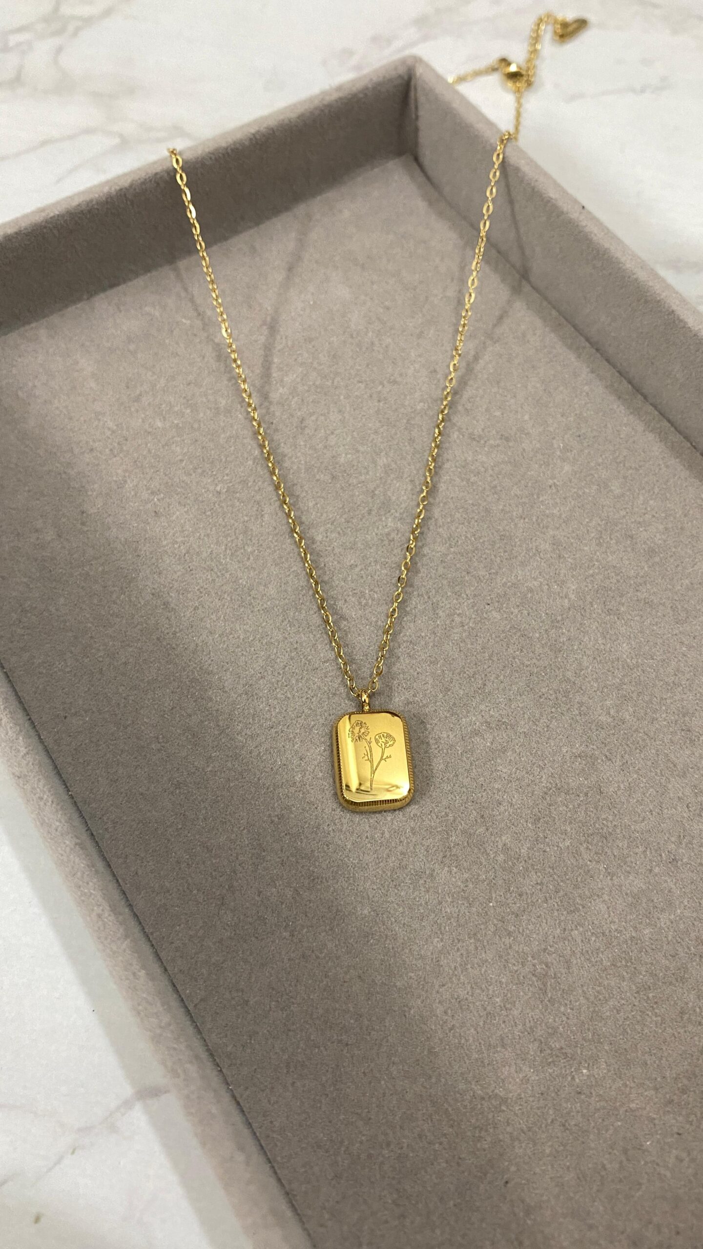 The necklace features a small, rectangular pendant with rounded corners, showcasing a finely detailed, etched dandelion or floral motif. This vintage-inspired design is subtle yet sophisticated, perfect for adding a touch of nature-inspired elegance to any outfit.